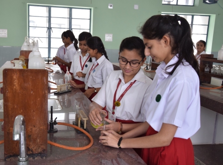 A properly ventilated Chemistry lab provides for all the needs of the various students of classes IX to XII, where, they can perform a variety of experiments in groups of maximum 35 students. The lab is equipped with 80 lockers, reagent bottle shelves on the desks, distilled water, fume chamber and a petrol gas plant (LPG cylinder is used during emergencies). A storage room, well stocked with chemicals, apparatus and a number of charts required for different classes is present, and under the expert supervision of the lab assistant and the Chemistry teacher.